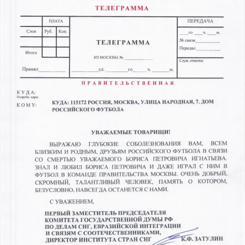 Соболезнования в связи со смертью экс-тренера сборной России по футболу Бориса Игнатьева