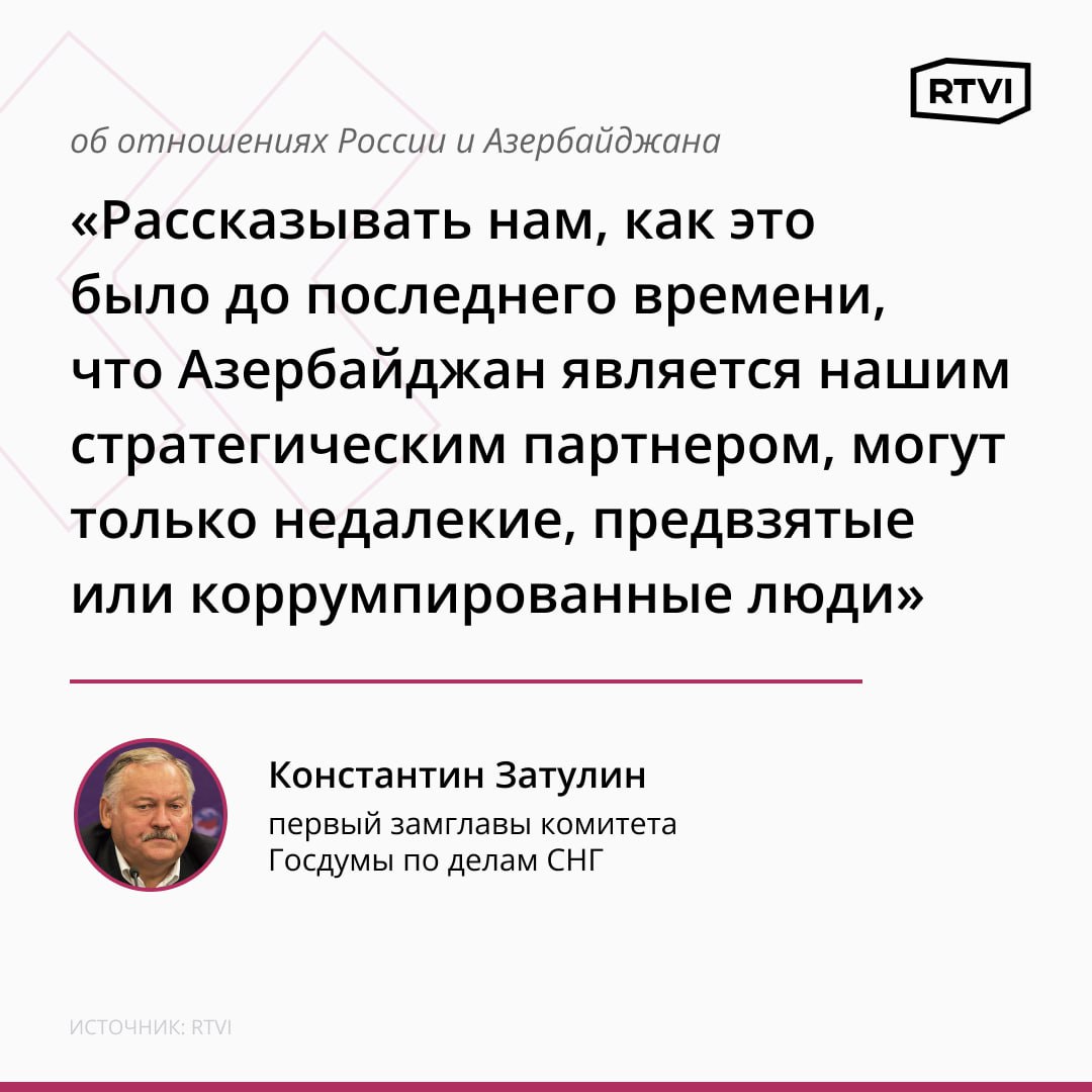 В ухудшении отношений Москвы и Баку «виновата геополитическая устремленность» Азербайджана, который хочет быть партнером Турции в ее планах по «созданию Великого Турана». Так в беседе с RTVI первый замглавы комитета Госдумы по делам СНГ Константин Затулин отреагировал на слова азербайджанского президента Ильхама Алиева о том, что республика «не несет ответственности за ухудшение отношений» с российской стороной.