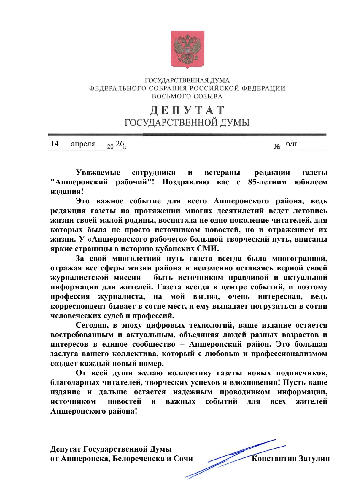 Сегодня, в эпоху цифровых технологий, ваше издание остается востребованным и актуальным, объединяя людей разных возрастов и интересов в единое сообщество – Апшеронский район. Это большая заслуга вашего коллектива, который с любовью и профессионализмом создает каждый новый номер.