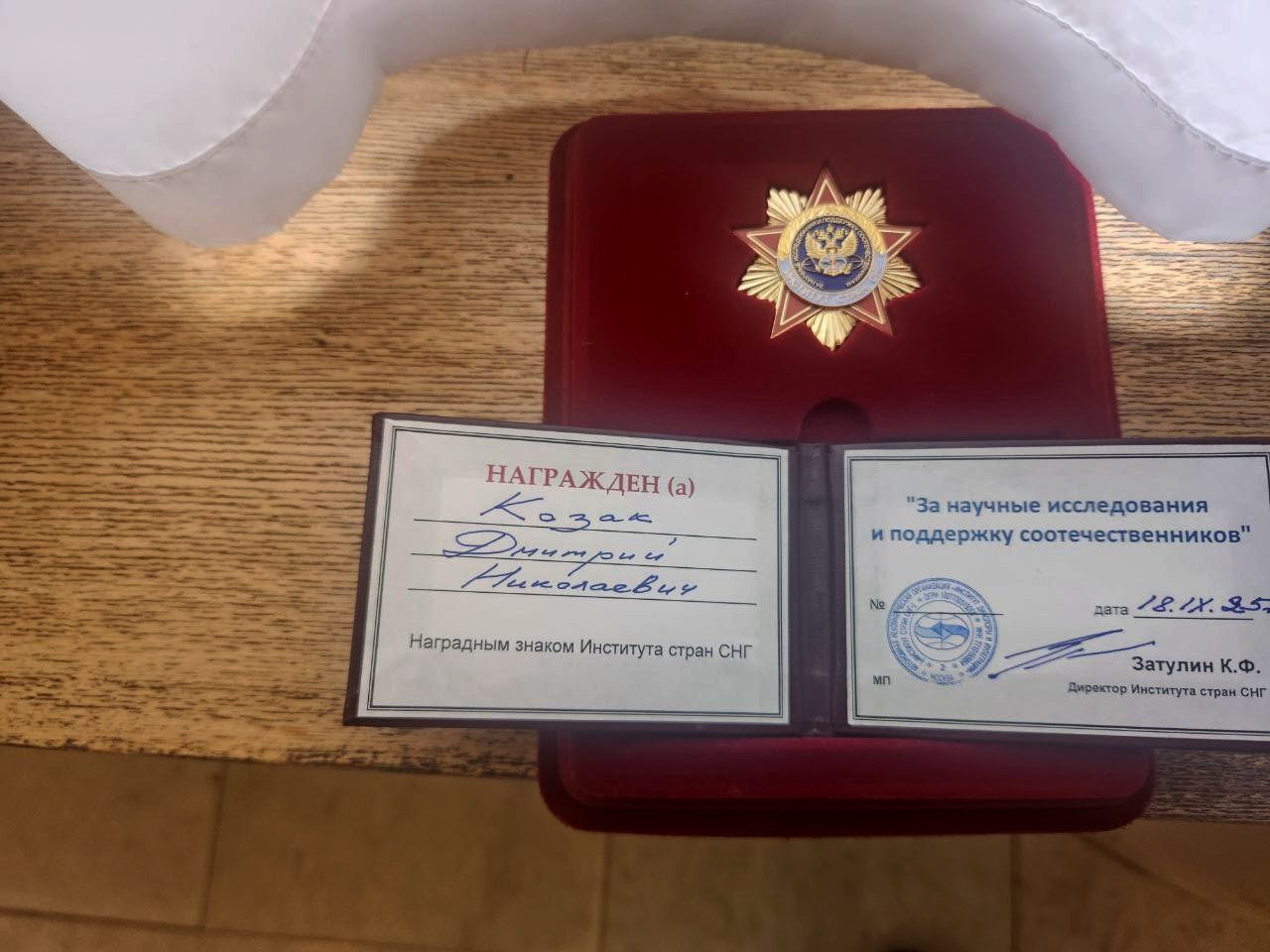 Прочёл кучу разных версий его отставки и будущей судьбы. Кто-то ближе, а кто-то дальше от истины. Я не вправе комментировать. Но вчера счёл своих долгом напроситься на приём и вручил Дмитрию Николаевичу, вместе с Благодарственным письмом, награду нашего Института стран СНГ — Почётный знак «За научные исследования и поддержку соотечественников». «Всё, что могу», — как говорил генерал Жжёнов в фильме «Горячий снег».