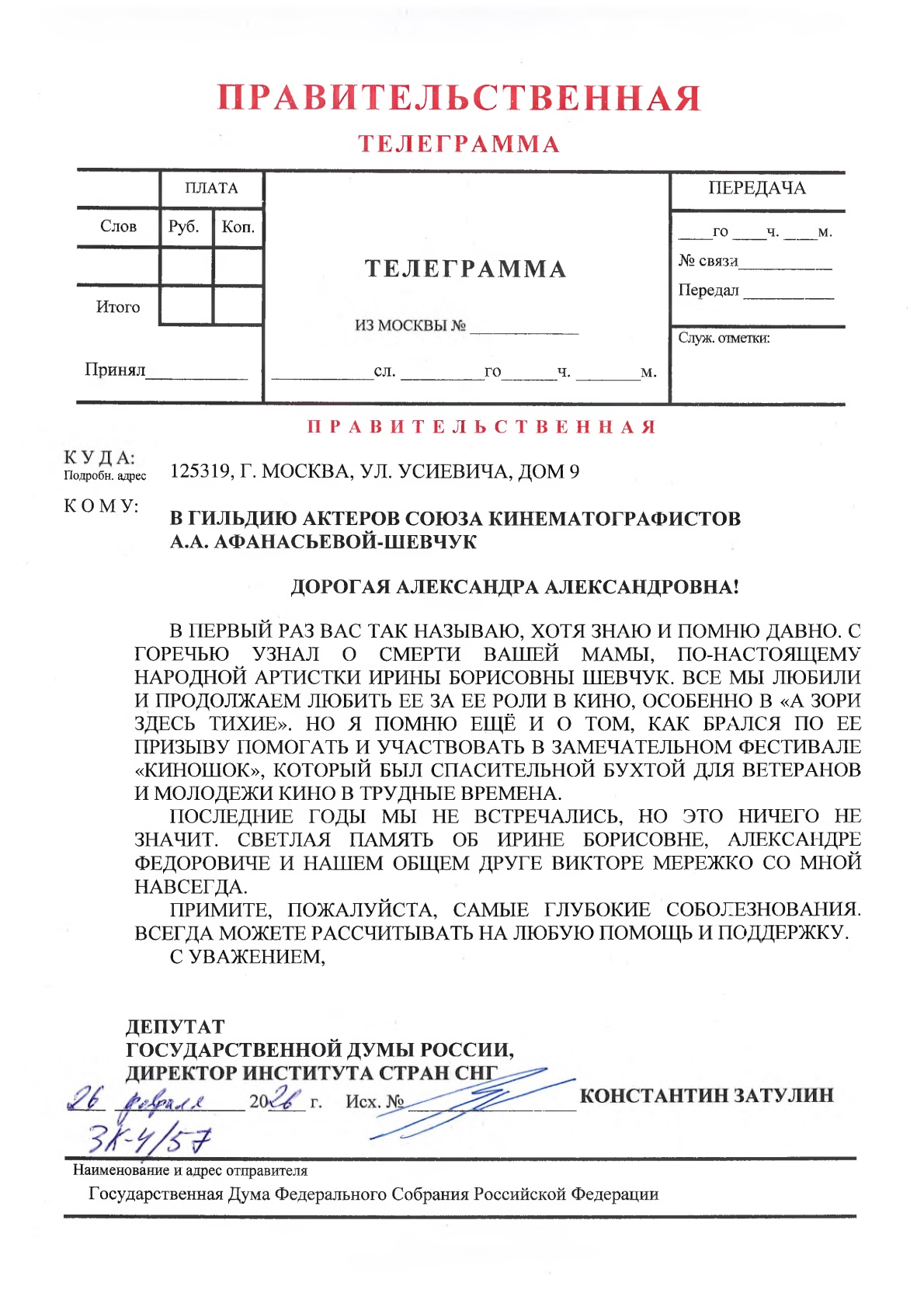 Депутат Государственной Думы России, директор Института стран СНГ Константин Затулин направил соболезнования А.А. Афанасьевой-Шевчук, дочери народной артистки России Ирины Шевчук: