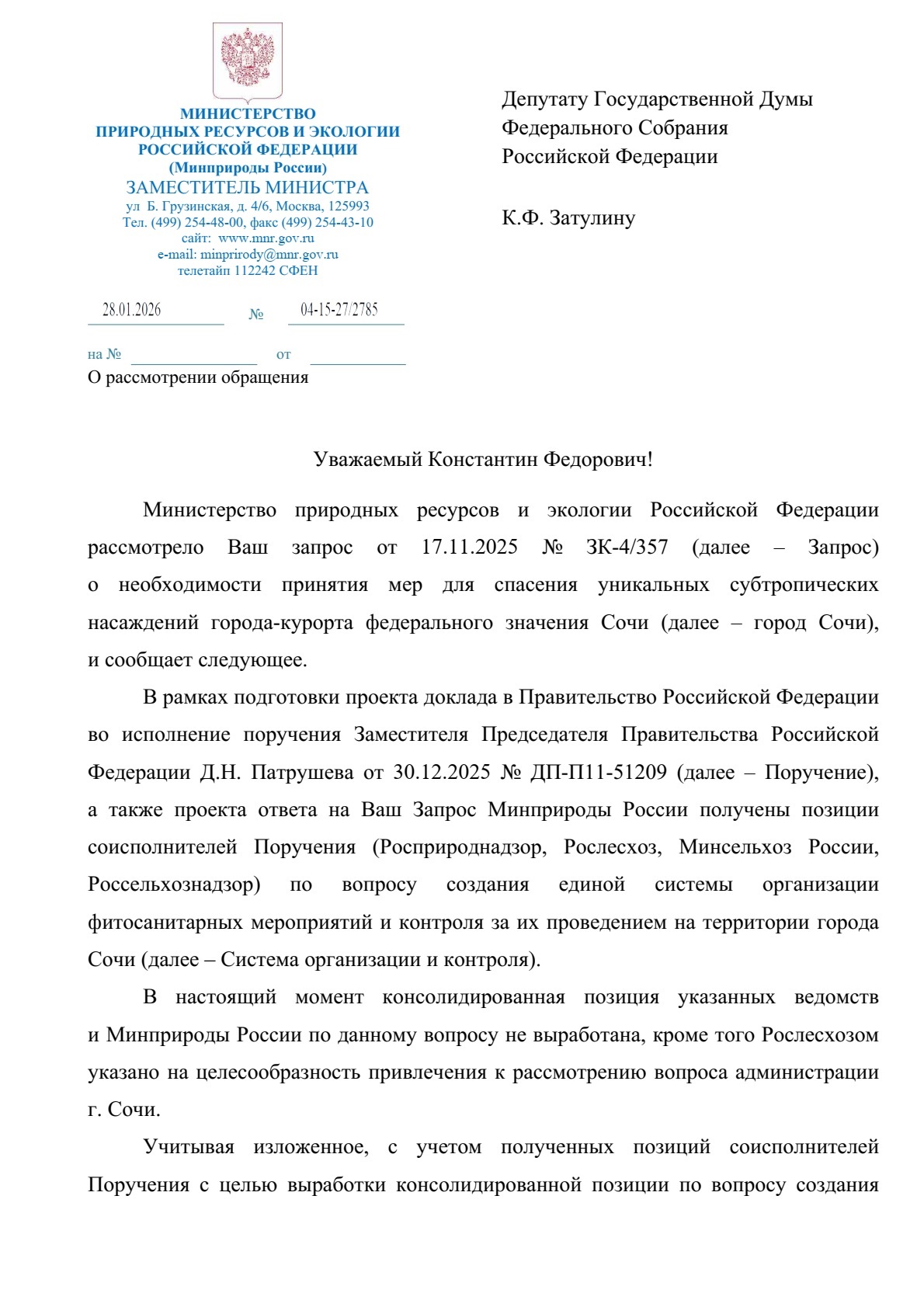Константин Затулин получил ответ Министерства природных ресурсов и экологии Российской Федерации на запрос о необходимости принятия мер для спасения уникальных субтропических насаждений города-курорта федерального значения Сочи: