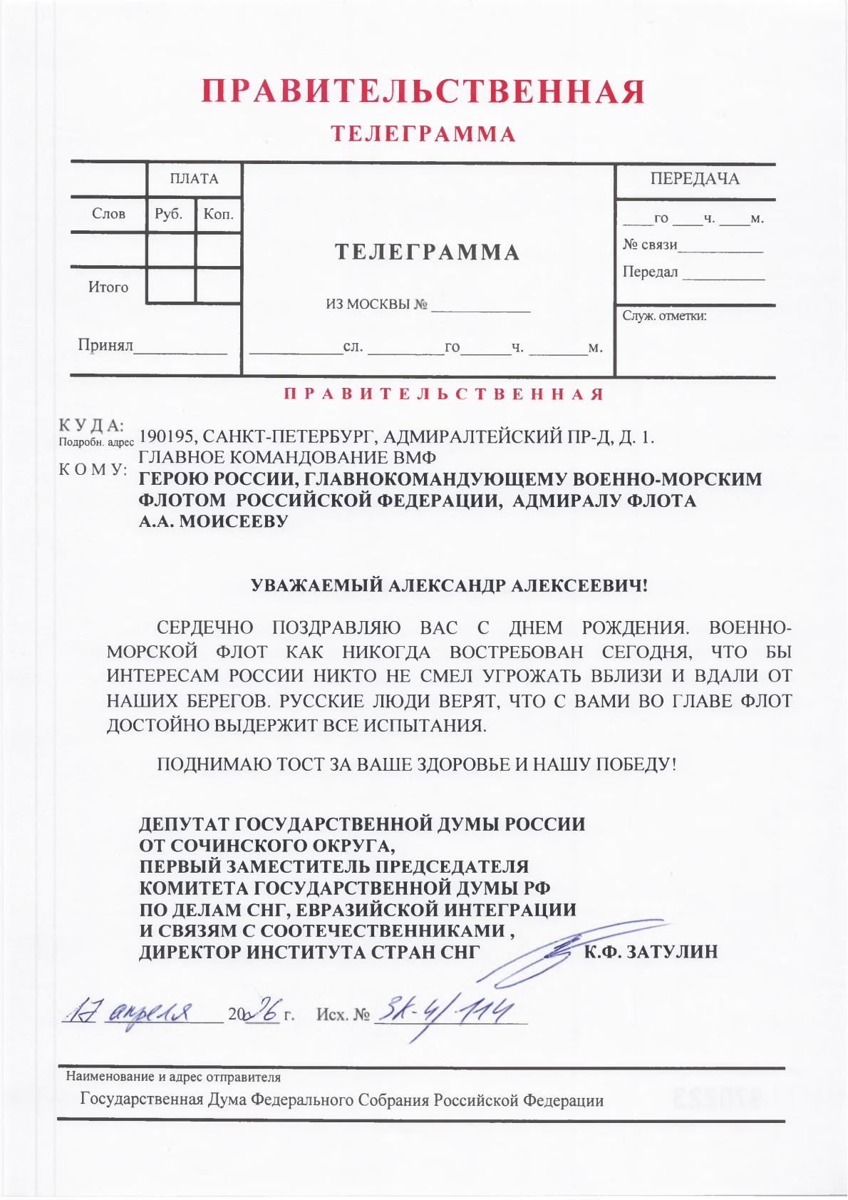 Депутат Государственной Думы России от Сочинского округа, Первый заместитель председателя Комитета по делам СНГ, Евразийской интеграции и связям с соотечественниками, Директор Института стран СНГ Константин Затулин поздравил Героя России, Главнокомандующего Воено-Морским флотом Российский Федерации А.А. Моисеева: