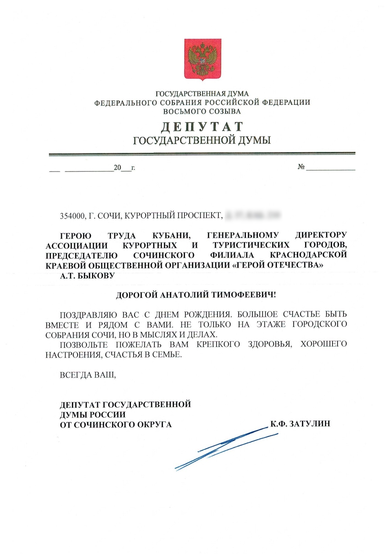 Депутат Государственной Думы России от Сочинского округа Константин Затулин поздравил с Днём рождения Героя Труда Кубани, генерального директора Ассоциации курортных и туристических городов Анатолия Быкова: