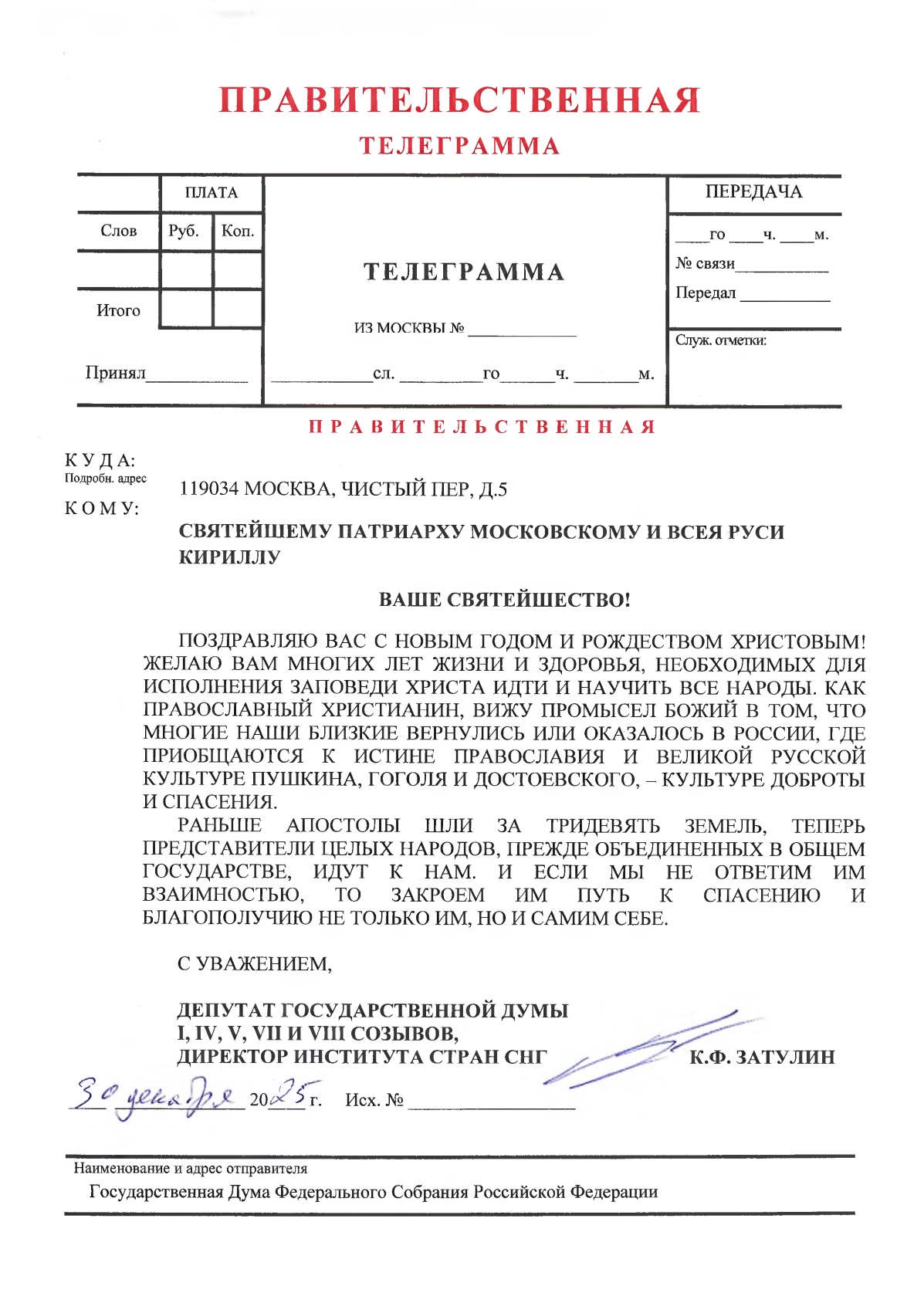 Депутат Государственной Думы Российской Федерации I, IV, V, VII, VIII созывов, директор Института стран СНГ Константин Затулин направил поздравление Святейшему Патриарху Московскому и Всея Руси Кириллу, ряду священнослужителей Русской православной церкви: