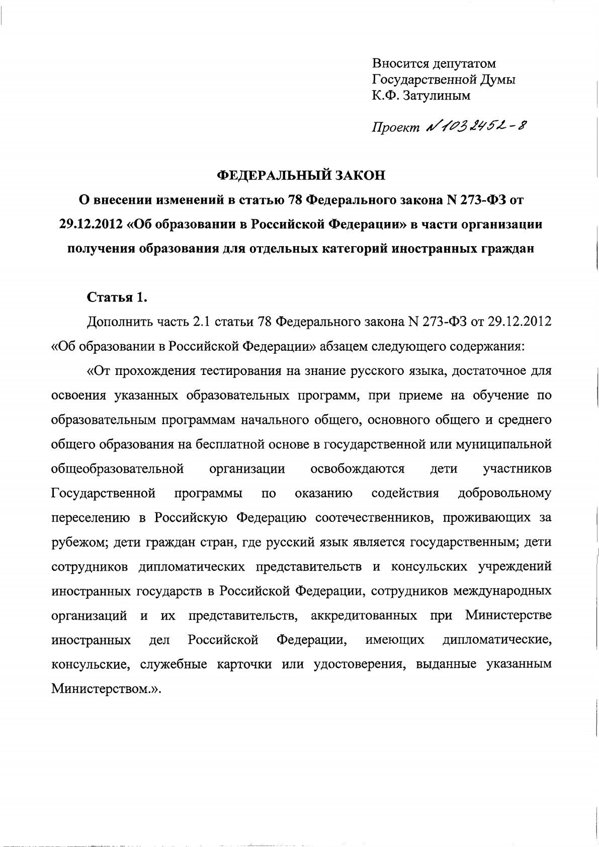 Пояснительная записка и текст законопроекта № 1032452-8 «О внесении изменений в статью 78 Федерального закона N 273-ФЗ от 29.12.2012 «Об образовании в Российской Федерации» в части организации получения образования для отдельных категорий иностранных граждан», внесенного Константином Затулиным в Государственную Думу: