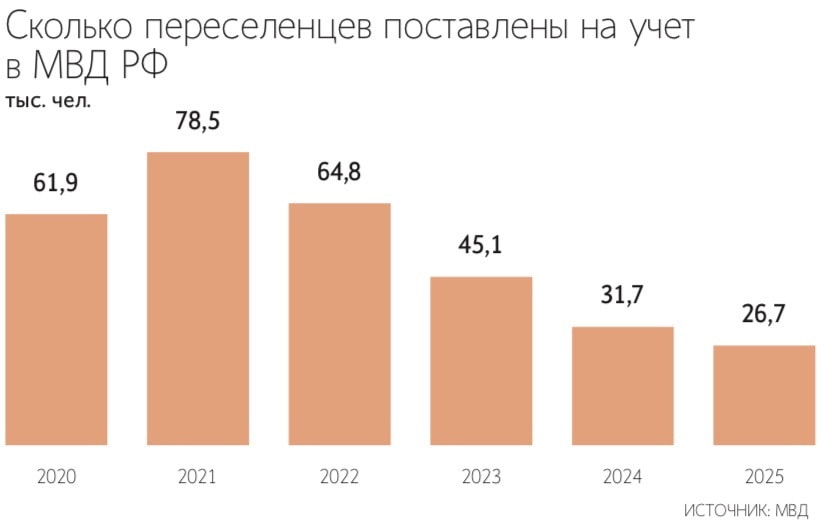За 2025 г. на учет в территориальных органах МВД встало около 26 700 участников государственной программы по добровольному переселению в Россию соотечественников, проживающих за рубежом. Такой вывод «Ведомости» сделали на основе обновленной статистики министерства. Их количество уменьшилось почти на 16% по сравнению с 2024 г. Тогда на учет встали 31 700 человек.