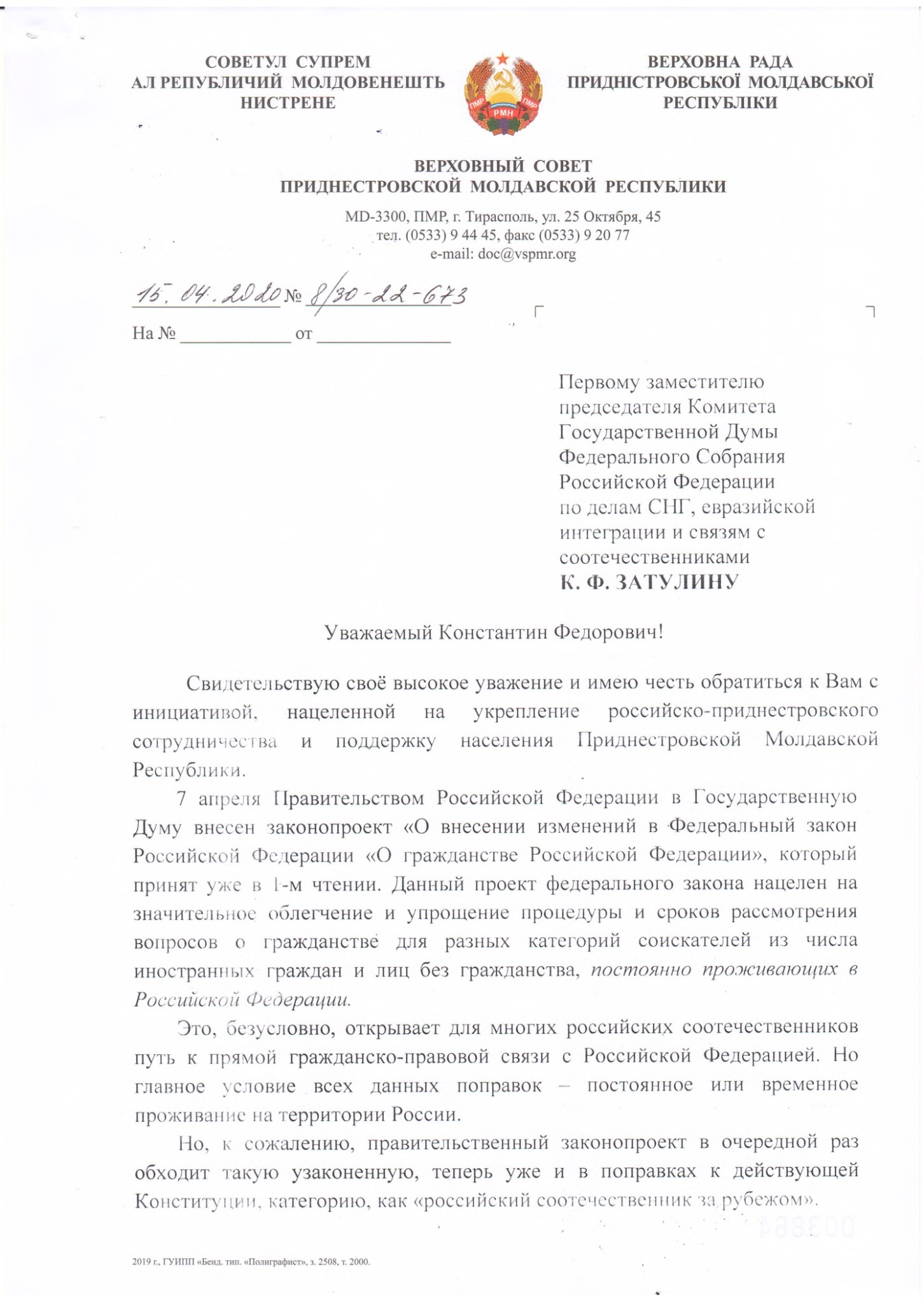 Президент и Верховный совет Приднестровья обратились к спецпредставителю Государственной Думы РФ по вопросам миграции и гражданства, Первому заместителю Председателя Комитета Государственной Думы РФ по делам СНГ, евразийской интеграции и связям с соотечественниками Константину Затулину с просьбой оказать содействие в принятии поправок в закон «О гражданстве Российской Федерации» во втором чтении, учитывающих интересы соотечественников живущих за рубежом.