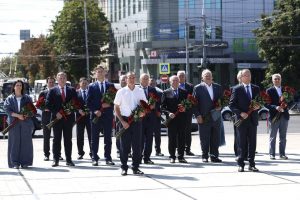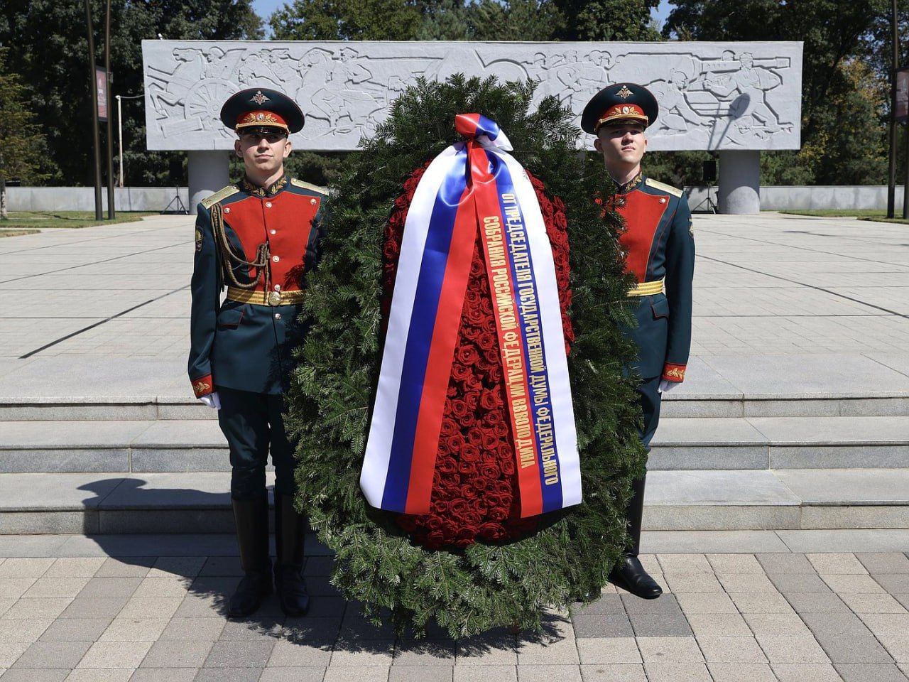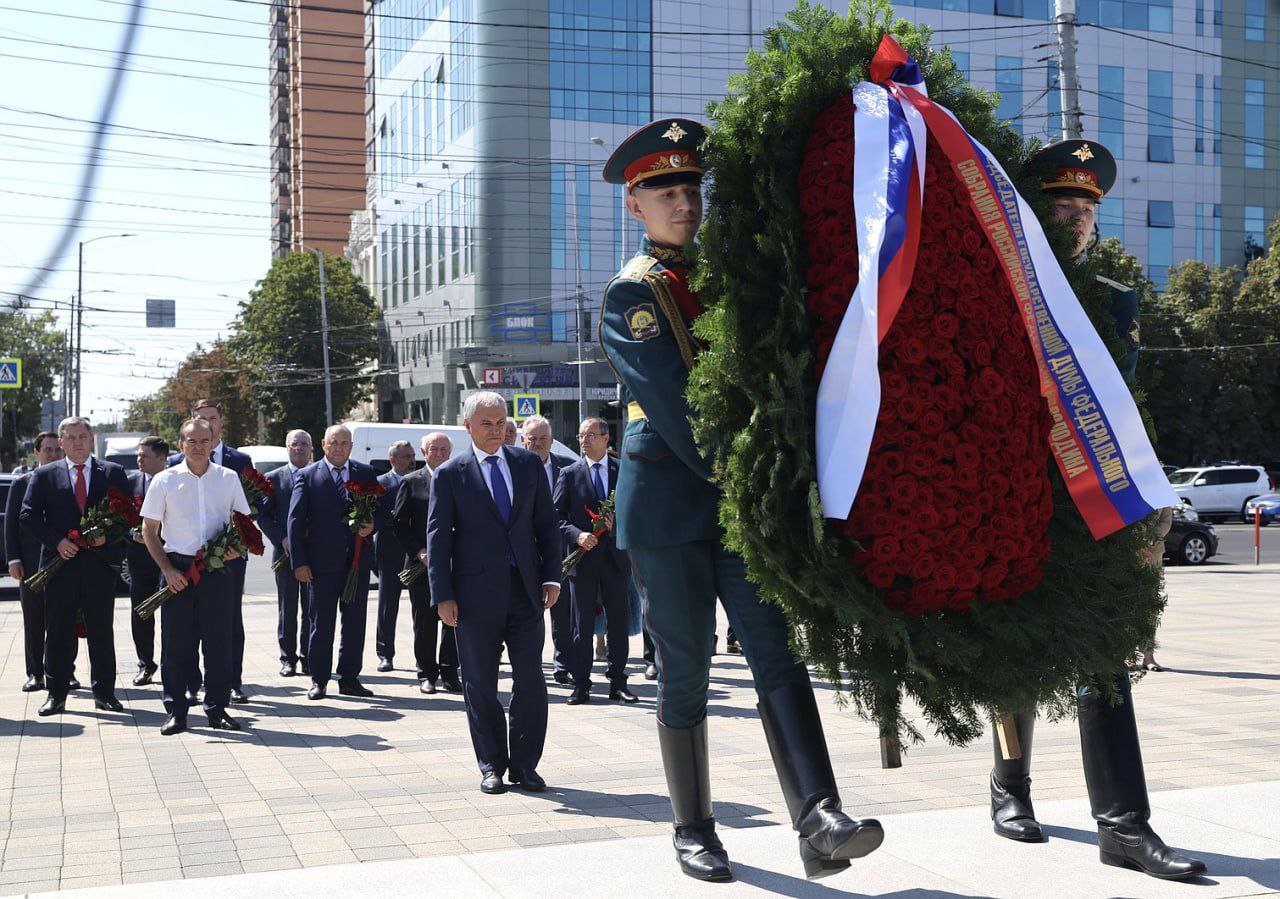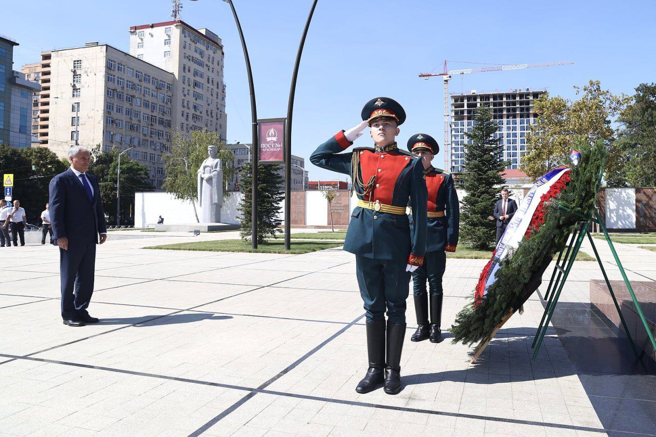 Константин Затулин принял участие церемонии возложения венка и цветов к мемориалу Советским воинам-освободителям на Площади Памяти Героев в Краснодаре.